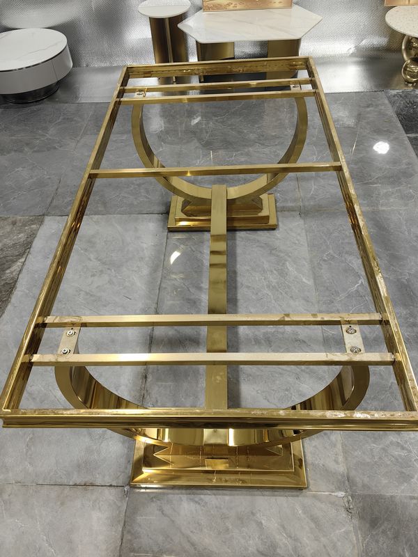 Esta mesa de jantar de mármore de aço inoxidável é uma mistura perfeita de elegância moderna e funcionalidade robusta.que apresentam veias naturais e uma superfície polida que exala sofisticaçãoA sua forma retangular oferece amplo espaço para jantar, tornando-o ideal tanto para jantares familiares íntimos como para reuniões maiores.